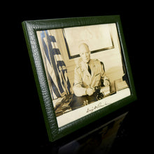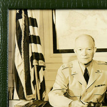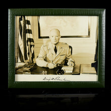 Monochrome photograph of the 34th President of the United States seated at his desk in service dress uniform with a copy of ‘The Life of Sir Arthur Conan Doyle’ (1949) before him. Inscribed by the sitter ‘Dwight D. Eisenhower’. SHAPE wetstamp credit to verso. Image size: 20cm (8in) x 25cm (10in). Contained in faux crocodile leather easel backed glazed frame.