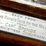 In the form of a Nile mud brick set in an oak surround applied with plaque inscribed ‘BRICK FROM / THE MAHDI’S TOMB ON THE NILE / FROM / CAPT. SPONGE / MARCH 15th 1899 OMDURMAN’.