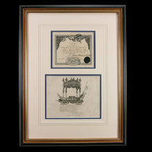 Printed card with inked inscriptions and wax seal of Sir Isaac Heard, Garter King of Arms. Ticket for the ‘Funeral of the late Vice Admiral Horatio Viscount Nelson to admit George Matcham Esq, nephew of the late Viscount into the Procession from the Admiralty to St Paul’s Cathedral’. No. 416. Ticket: 15cm x 18cm. Framed and glazed with a contemporary flyer, published 9 January 1806 and printed with a depiction Nelson’s funeral car and a verse from ‘Nelson’s Tomb’ by the Naval Pay Office employee and poet W.T. Fitzgerald.