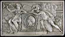 An extremely fine and extremely rare rectangular plaque in silver commemorating Admiral Lord Nelson; the relief panel centered on a wreathed bust of the naval hero on a sarcophagus, over a battle honour scroll bearing the names Nile, Copenhagen, Trafalgar, flanked by figures of winged Fame with fanfare trumpet amid clouds, a crocodile at her feet, referencing the 1798 victory at Aboukir Bay, and mourning Britannia armed with a Union Jack shield and with the British lion at her feet, in the distance the stern of H.M.S. Victory. Signed lower right ‘P. WYON. F’[ecit].
