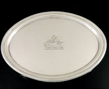 An oval salver with reeded edge on four scroll feet, the centre engraved with the unique armorial crest granted to England’s greatest frigate captain Sir Edward Pellew in March 1796 in recognition of his gallantry in saving the lives of hundreds men, women and children on 26 January of that year - the crest being ‘Upon waves of the sea, the wreck of the Dutton, East Indiaman, upon a rocky shore, off Plymouth garrison’. Maker’s mark of London silversmith William Bateman. Hallmarked London 1803.