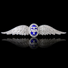 Pilot’s wings in platinum set with diamonds, entered on a royal blue enamel oval overlaid with the letters ATA in platinum, and surrounded by diamonds.