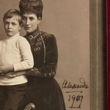 Sepia tinted portrait photograph of Queen Alexandra with her grandson Prince Olav, later King Olav V of Norway. Signed and inscribed in ink in the Queen’s hand ‘Little / Olav’ and ‘Alexandra 1909’. Framed and glazed.