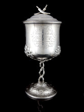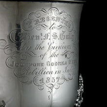 Silver cup and cover, the bowl engraved with foliate scrollwork and bearing presentation inscription ‘Presented / to / Lieut. F.S. Gully / by the Civilians /of the / Jounpore Goorka Mess / Rebillion [sic] in India / 1857’ ‘, supported on stem modelled as intwined vines rising from a naturalistically modelled base, the cover with crossed kukris finial.