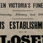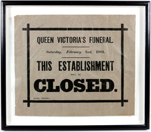Printed paper notice. Inscribed with a black border, ‘Queen Victoria’s Funeral. Saturday, February 2nd, 1901. / This Establishment / Will Be / Closed.’ / ‘Loder, Printer].