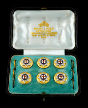 Eighteen carat white and yellow gold and enamels. A set of six, each marked ’18’ to the reverse. Contained in original case by Ortner & Houle of 3 St. James’s Street, London.