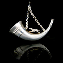 Silver. Badge of office for Comptroller and Lady Patroness of the Anglesey Hunt for 1858, in the form of a hunting horn decorated with a hound ‘en Courant’, and inscribed ‘1859 / Captain / Thomas Lewis Hampton / of Henllys / Comptroller // Miss Maria / Emma Elizabeth Griffiths / of Carreglwydd / Lady Patroness.’ Maker’s mark of George Cowie. Hallmarked 18