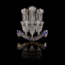 The Prince of Wales’s feathers in white gold set with diamonds, issuing from the white gold coronet set with diamonds over the regimental title scroll in yellow gold and blue enamel.