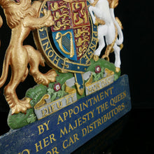 Polychromed metal Royal Warrant Holder’s sign inscribed 'By Appointment To Her Majesty The Queen Motor Car Distributors’.