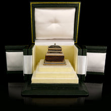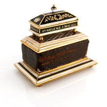 Mahogany, gold and enamel. A relic of the exhumation and return of Napoleon I’s mortal remains from St. Helena to France in 1840, comprising a piece of mahogany from the outer coffin in which the Emperor was interred in 1821, applied with a miniature coffin in gold set with enamels, and inscribed with the date of the emperor’s death - ‘Sainte-Hélène 5 mai 1821’ (St. Helena 5 May 1821), - and, last words, ‘Mon fils, tête de l’Armée, France’ - (My son, head of the army, France); the coffin lid, hinged at the head end, opening to reveal a miniature recumbent figure of Napoleon in gold; the interior of the casket lid containing strands of Napoleon’s hair in a glazed compartment. The whole set upon a rectangular base plate in gold set on four ball feet, the underside engraved ‘Bois du Cercueil de / NAPOLEON / rapporté par le Cte Phpe / de Chabot le / Octobre 18, 1840’ (Wood of the Coffin of Napoleon brought back by Count Philippe de Rohan-Chabot).