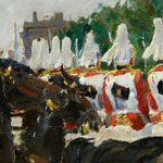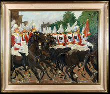 In the 1920s Irwin worked in St. Ives, Mevagissey, Polperro; and perhaps still under the influence of Gaugin’s Breton paintings of the 1880s he revisited Brittany - such being evident in ‘Pontaven: le jour du Pardon’ which he exhibited at the Royal Academy in 1938. In 1926 he studied at the Académie Royale des Beaux Arts, in Brussels, but by the mid 1930s had settled at Ewell in Surrey. From here he had easy access to the ceremonial duties performed by the Household Division in central London, as well as the military pomp of George V’s Silver Jubilee in 1935 and the Coronation of George VI in May 1937. Vivid and energetic paintings worked around these themes perfectly capture the quintessentially English essence of early summer in St. James’s and the perfection of British ceremonial performed by the Guards' regiments.