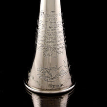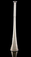 A silver hunting horn of unconventional length, engraved with quarry and hounds and inscribed, ‘Presented to Admiral J. Lort Stokes / By tenants and numerous friends / as a memento of many years / sport & pleasure in connection with / his excellent pack of hounds / Haverford West / July 1884’. Maker’s mark of by W.W. Harrison & Co. Hallmarked Sheffield 1884.