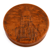 Pressed burr wood. Circular snuff box, the lift off lid with a relief view of 'L'Hôtel des Invalides' (Les Invalides) and the legend ‘Vue De Portail Et Du Dome Des Invalides Commencee et Term En 1706’. The base worked with pressed geometric pattern weave.