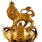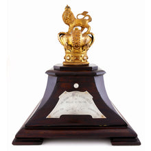 Gilt metal & wood. In the form of the royal crest - the Imperial Crown, thereon a lion statant guardant, imperially crowned. The finial mounted on a dark wood concave ogee moulded base with champfered corners and a spring loaded compartment to the front applied with a silver plaque inscribed, ‘The Crown From The Queen’s Colour / of / Baillie-Ki-Paltan / Formed 1759 / Disbanded 1933’. Maker’s label of ‘Barton, Son & Co. / Silversmiths / Bangalore & Ootacumund’.