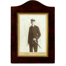 Sepia toned three quarter length portrait Prince Albert in Midshipman’s uniform, with left hand on the hilt of his dirk. Contained in original glazed period frame with gilt slip and easel backed Morocco frame by Edwards & Sons, 159 Regent Street, London.