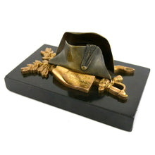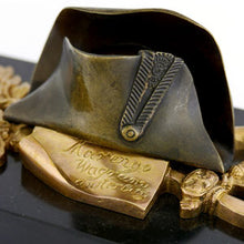 Ormolu mounted black marble base applied with gilt bronze sword laurel branches and a scroll inscribed with Napoleon’s great victories of Marengo, Wagram, Austerlitz; all surmounted by the Emperor’s bicorne hat in patinated bronze.