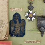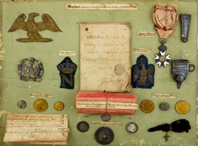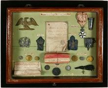 Comprising a collection of battlefield relics contained in glazed drawer labelled in a nineteenth century hand ‘Trophy’s found in the Field after the Battle of Waterloo’, comprising a First Empire Legion d’Honneur (2nd type) Chevalier’s breast badge, (56mm x 37mm), in silver, gold and enamel, unmarked, with ribbon and rosette, one section of wreath missing, the enamel damaged, labelled ‘Cross & Riband of the Legion of Honour’; a length of and faded Grand Cross sash ribbon, labelled, ‘The Cordon of the Legeon (sic) of Honor worn by a French General Officer in the Battle’; other ranks’ cartridge box plate in brass; silver crowned eagle badge from the gorget of an officer of the Imperial Guard, two bullion embroidered officers’ turnback badges on cloth backing - one a crowned eagle, the other a crowned letter ‘N’, with labels ‘Worn on the breast of an Officer’; top and bottom silver sword chapes; buttons (6), all different, labelled, ‘Buttons of French Soldiers killed in the Battle’; small keepsake badge in the form of an ascending dove; French coins (4) - all pierced, labelled, ‘Money found with some of the dead’; manuscript soldiers instructions booklet, in French’; a handwritten list, in French, additionally inscribed, ‘taken off the field at Waterloo 26 June 1815’.