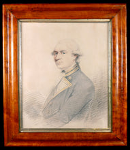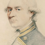 Joseph Slater (circa 1779-1837) began his career as a portrait painter in London, first exhibiting first at the Royal Academy in 1803. He worked principally in pencil, crayons and watercolour, as can be seen in his 1813 portrait of Admiral Lord Gambier which is stylistically similar to the present work [NPG 1982]. The present portrait, however, is possibly a posthumous one, worked up by Slater in 1810 from Charles Grignon’s oil portrait of 1780 [NMM BHC2942] or from James Watson’s mezzotint thereof. Evidence for this may be found in Pearson’s outdated uniform. In Grignon’s portrait, Pearson wears the 1774-87 pattern full dress uniform coat with white lapels of a Captain R.N. (with three years’ seniority). In 1795 this changed to blue lapels and the coat was embellished with epaulettes. Furthermore the tie-wig worn by Pearson in Grignon’s portrait was an anachronism by the early 19th century, having fallen out of favour after the imposition of William Pitt’s Powder Tax of 1795. Moreover the subject arguably looks the same age in both pictures. The National Maritime Museum has questioned the origin of the Pearson portrait that appeared in the ‘Naval Chronicle’ in 1810 [PAD3096]. Here, we believe, is the answer.