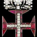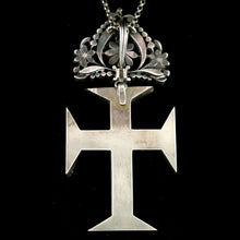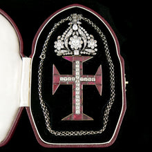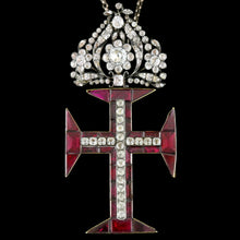 Clear and red paste on foil backed silver cross with foliate paste set suspension on period chain. Contained in modern velvet lined case.