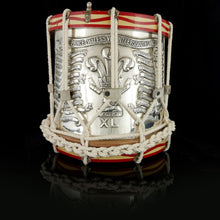 Silver cylinder with painted wood hoops, rope tension system, and ice bucket liner. The cylinder chased with regimental title scroll inscribed ‘1st Battalion Prince of Wales's Volunteers (South Lancashire)’ over the Prince of Wales’s feathers, Sphinx badge and regimental number ‘XL’, flanked by Battle Honours to the end of the First World War. Complete with miniature ebony drumsticks. Maker’s mark of Hawkes & Son. Hallmarked London, 1925.