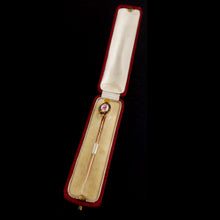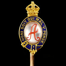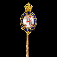 Yellow gold mounted reverse painted glass intaglio ‘A’ cypher of Queen Alexandra (1844-1925), Queen Consort to Edward VII (reigned 1901-1910), encircled by the Garter motto ‘Honi Soit Qui Mal Y Pense’ Shame on him who thinks ill of it) in yellow gold and blue enamel, all beneath the Imperial State Crown in yellow gold. Contained in its original red morocco case.