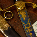 Like the 1803 pattern infantry sabre carried by Flank Company officers in the Army, this curved naval sword would have provided its owner with weapon better suited to close quarter fighting than the straight swords commonly used from the mid 1790s. Given a blade length of 60.5cm (23.75in) and no regulation pattern swords until 1805, the present sword was possibly made to the order of a Master, Mate or Midshipman. Captain Bosanquet in his book ‘The Naval Officer’s Sword’ (1955) states that Dress Regulations dictated that a Midshipman might wear a sword similar to the master but ‘of such length as may be convenient’.