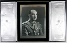 An autographed black and white head and shoulders portrait photograph of Mohammad Zahir Shah. Signed in the king’s hand upper left and presented in a bespoke mahogany backed silver frame applied with gold tughra as displayed on the reverse of the royal flag of Nadeer Shah. The whole contained in a velvet lined fitted case with silks emblazoned with the royal arms: a mosque with a minbar and a mihrab, between two national flags in the base, the date 1348 H (the solar Islamic calendar equivalent of 1929 AD - the year Zahir Shah's dynasty came to power) set within a garland of ears of wheat tied with a ribbon, over the motto ‘Afghanistan’ in arabic script.