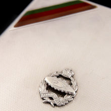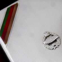Silver. Rectangular case with engine turning to the hinged lid, applied with the badge of the RTR and the top left corner set with the enamelled regimental stripe of brown, red and green symbolising the RTR unofficial motto - ‘Through the mud and the blood to the green fields beyond’. Gilt interior. Maker’s mark of JWB. Hallmarked 1928.