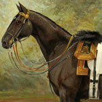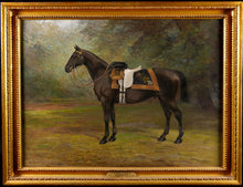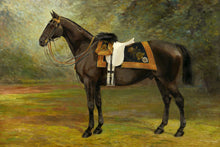 Oil on canvas. An officer’s charger of the 1st Life Guards the equipped with the full dress shabraque of blue cloth with the fore and hind quarters pointed; three stripes of gold lace and two of scarlet cloth all round. On each hind corner, a crown, scrolls bearing the Battle Honours ‘Dettingen’, ‘Peninsula’, ‘Waterloo’, ‘Egypt, 1882’ and ‘Tel-el-Kebir,’ and reversed LG cypher embroidered in gold with a Garter star below. Holster covers of blue cloth, laced to match the shabracque, with the crown and regimental cypher with one above embroidered in gold: black bearskin caps. Doeskin seat and white web surcingle. Signed and dated August 1899 lower left. Contained in a period gilt wood frame.