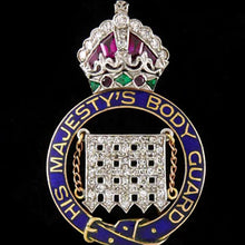Yellow gold and blue enamel garter inscribed ‘His Majesty’s Body Guard’ encircling the Tudor royal badge of the portcullis in white gold pavé set with diamonds, the whole surmounted with the Imperial State Crown in white gold set with eleven round cut diamonds, three lozenge and half -lozenge emeralds, rubies and with four rubies.
