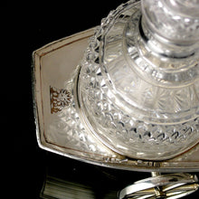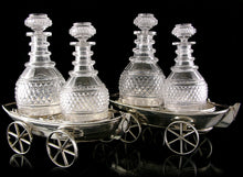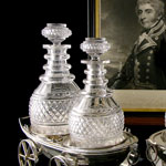 In the form of a pair of Old Sheffield plate (silver on copper) clinker-built rowing boats each set on a pair of detachable axles with spoked wheels, the interiors with two circular depressions for decanters and two for stoppers, rope-ring attachments to bows and engraved on the stern thwart with the armorial crest of ‘the sun rising from behind a cloud, all ppr.’ as granted to Rear-Admiral Sir Henry Blackwood (1770-1832) at the creation of his baronetcy (Blackwood of the Navy) in the baronetage of the United Kingdom on 23 July 1814; complete with a matched set of two large and two smaller Regency decanters.