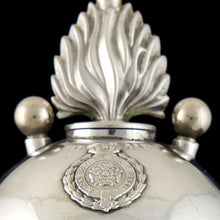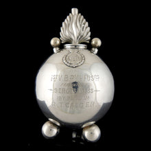 Silver plate. Grenade form lighter raised three ball feet and fitted with twin tapers. The front applied with the badge of the Royal Fusiliers over the inscription 1st V[olunteer] B[attalion] Royal Fusiliers cigar-lighters, each applied with the badge of the Royal Fusiliers ad inscribed ‘1st Volunteer battalion Royal Fusiliers / Presented to / Sergts. Mess / By Band Mr / R.T. Caiger.’