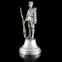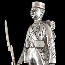 Silver figure modelled in pillbox hat, tunic with webbing, shorts, Lee Enfield 0.303 SMLE with bayonet and bare feet. Maker’s label of The Goldsmiths & Silversmiths Company, 112 Regent Street, London. Hallmarked London 1925